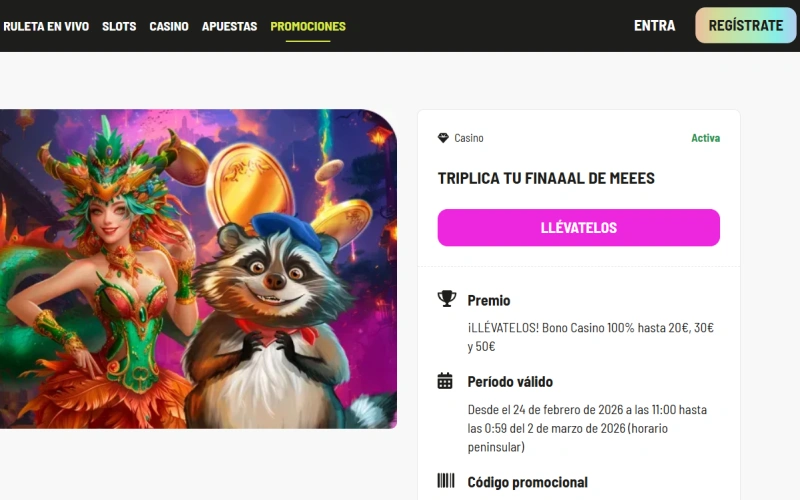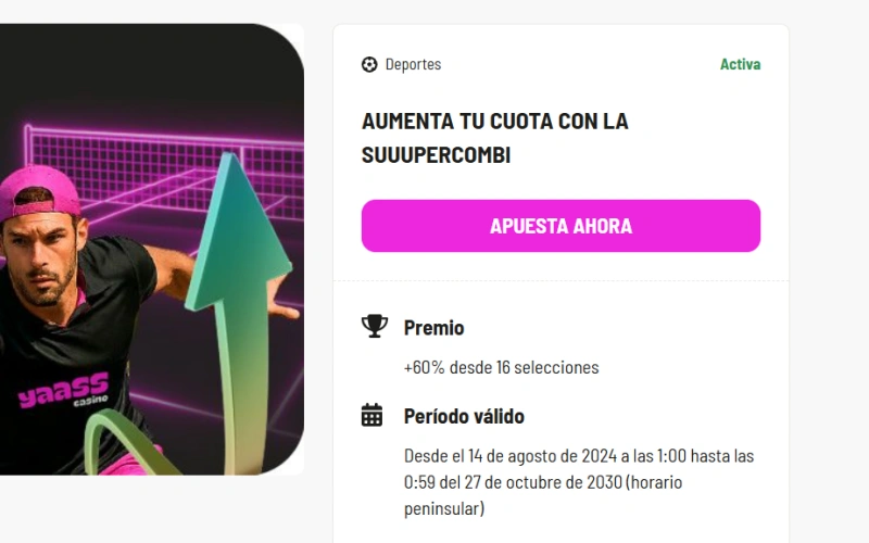 Los nuevos jugadores en España tienen acceso a una promoción especial al registrarse en la plataforma. Esta oferta incluye un 100% de bonificación sobre el primer depósito, hasta un máximo de 500 euros, además de 50 giros gratis para utilizar en tragamonedas seleccionadas. El bono de bienvenida casino Yaass está disponible únicamente para usuarios mayores de 18 años que realicen su primer ingreso. Se aplican requisitos de apuesta de 35x el monto del bono antes de poder retirar ganancias.